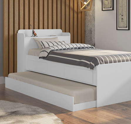 Principais características: 02 gavetas embutidas em sua barra lateral que pode ser montada em ambos os lados e 01 baú na cabeceira.