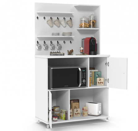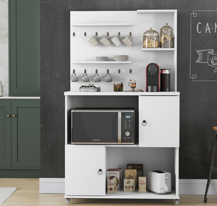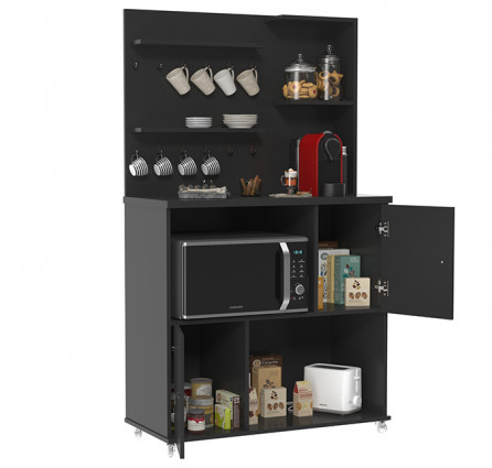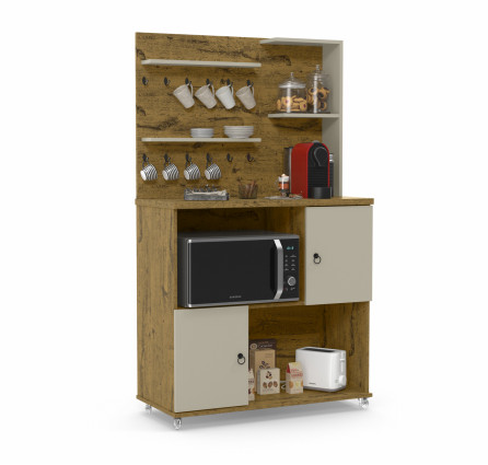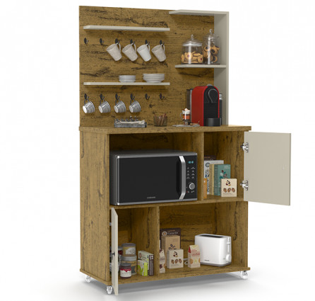 Com tampo de 25mm, nicho para micro-ondas e prateleiras com puxadores de metal.
