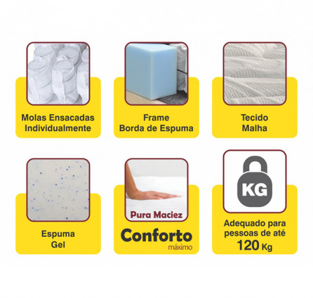 Camada de estofamento composta por uma espuma de alta resiliência , na camada de conforto está presente a manta em fibra siliconada e espuma hiper soft com gel sense, que possui sensação de frescor.