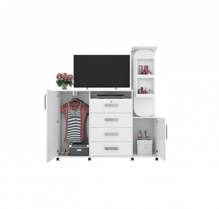 O produto conta com cabideiro em alumínio, puxadores cromados e rodízios.
