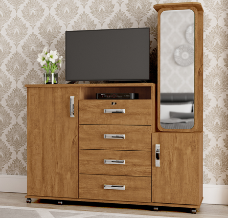 Possui espelho giratório com porta objetos, prateleira removível e trava na gaveta.