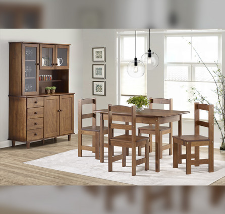 O conjunto Ilha Bela é composto por cadeiras, cristaleira e mesa.