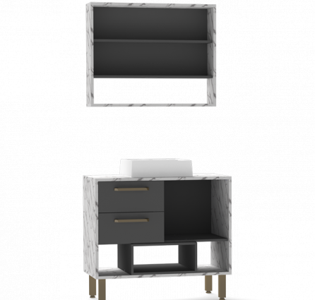 Possui 03 portas e 02 gaveta, com dobradiças de 26mm zincada, corrediças modelo trilho telescópico de 350mm e puxadores PVC bronze.