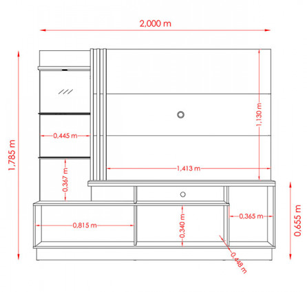 Painéis em MDP de 15, 25 e 40mm com pintura UV, portas deslizantes que se sobrepõem, prateleiras de vidro 5mm para objetos decorativos, espelhos, luminárias de LED e sistema de fixação com girofix.