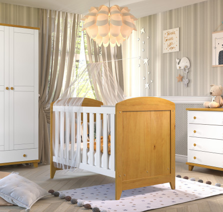 Berço com estrutura em madeira maciça de 25mm, pintura com acabamento acetinado/atóxico, estrutura com dupla regulagem de altura, bordas arredondadas, certificado pelo INMETRO.