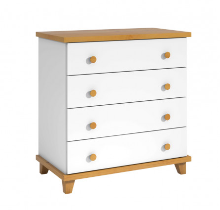 Cômoda 100% em madeira maciça de reflorestamento, com puxador cônico e pés com corte angular em madeira maciça, pintura com acabamento acetinado/atóxico.