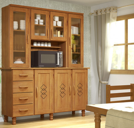 Kit cozinha/multiuso, produto misto em madeira maciça e chapas, portas com fechos magnéticos anti-empeno, moldura superior decorativa, fundos em multi laminados e antimofo, pés em madeira maciça, portas superiores com vidro cristal incolor, prateleiras de 15mm.