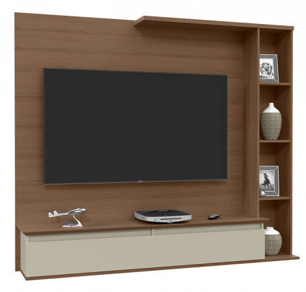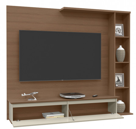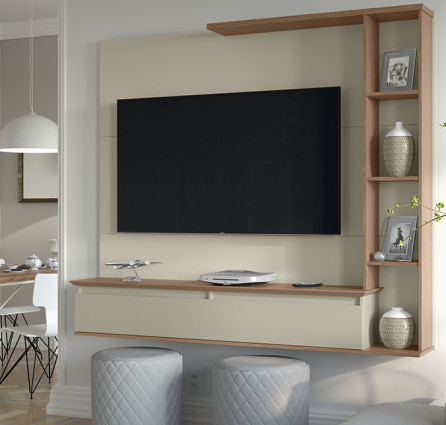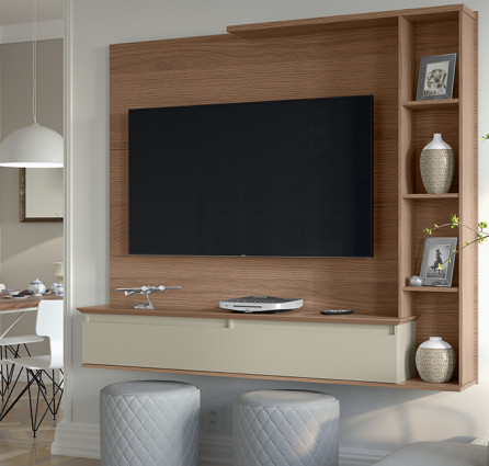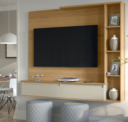 O Painel Sublime é compacto e moderno. Está disponível nas cores: novare/Off white, canelato/Off white, cumarú/Off white e Off white/canelato.