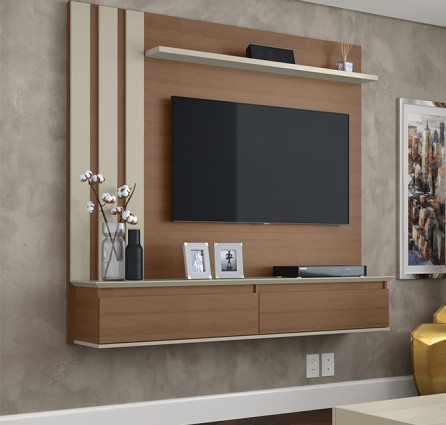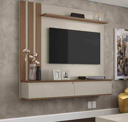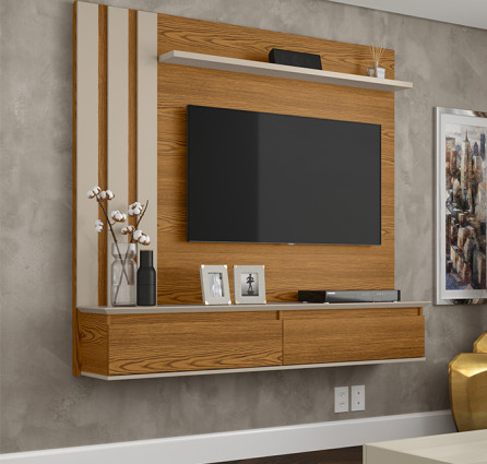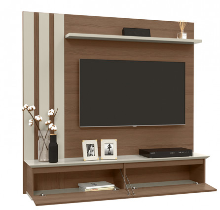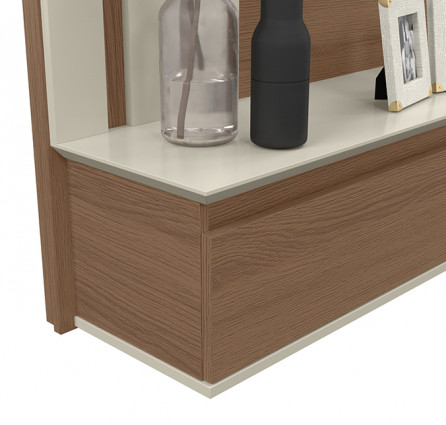 Detalhe ripado Tampo em MDF 25 mm, chanfrado Prateleira 25 mm Portas basculantes com dobradiças metálicas Espaço para TV: Larg 1250 x Alt 1010 mm TV até 46”