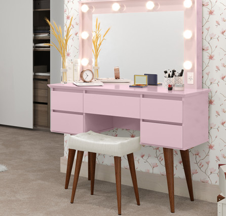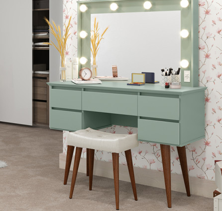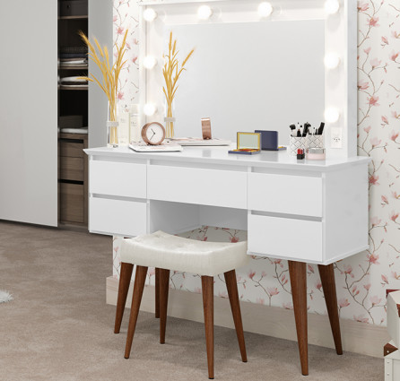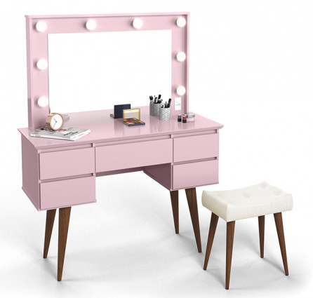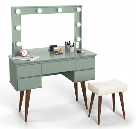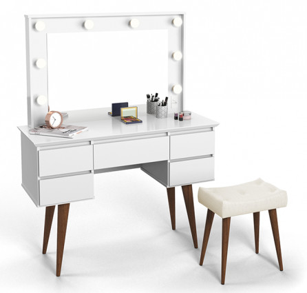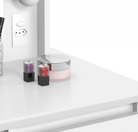 Tampo MDF 25 mm, chanfrado. Corrediças telescópicas. Tomada e soquetes para as lâmpadas. Pés palito em madeira maciça, com sapatas protetoras. Espelho com medidas generosas. Banquetas com almofada capitonê. Observação: As lâmpadas são ilustrativas.