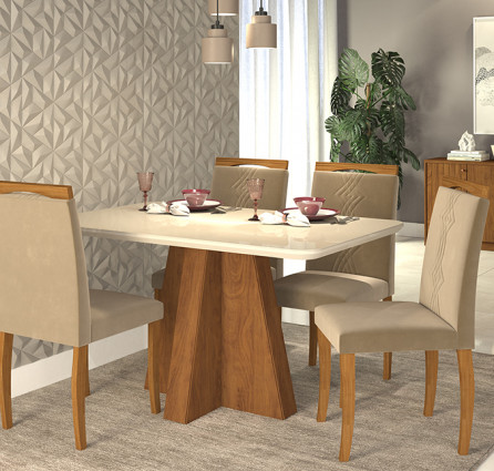 Mesa Maitê 1300x800 com tampo de MDF/vidro Cimol. A cadeira Laura é ideal para sala de jantar ou varanda conferindo à decoração do ambiente sofisticação e requinte.