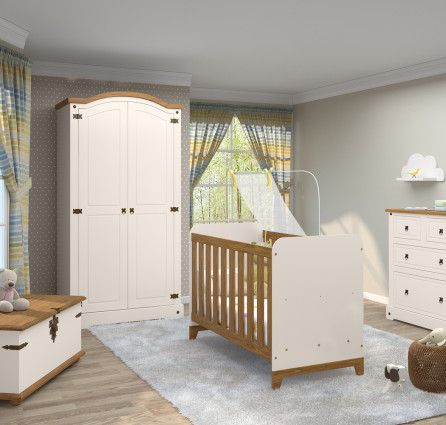 Berço com grades de madeira maciça de 15 e 25mm, estrado com dupla regulagem de altura, pés em madeira, mosquiteiro de metal, bordas arredondadas, pintura com acabamento acetinado/atóxico, certificado pelo INMETRO.